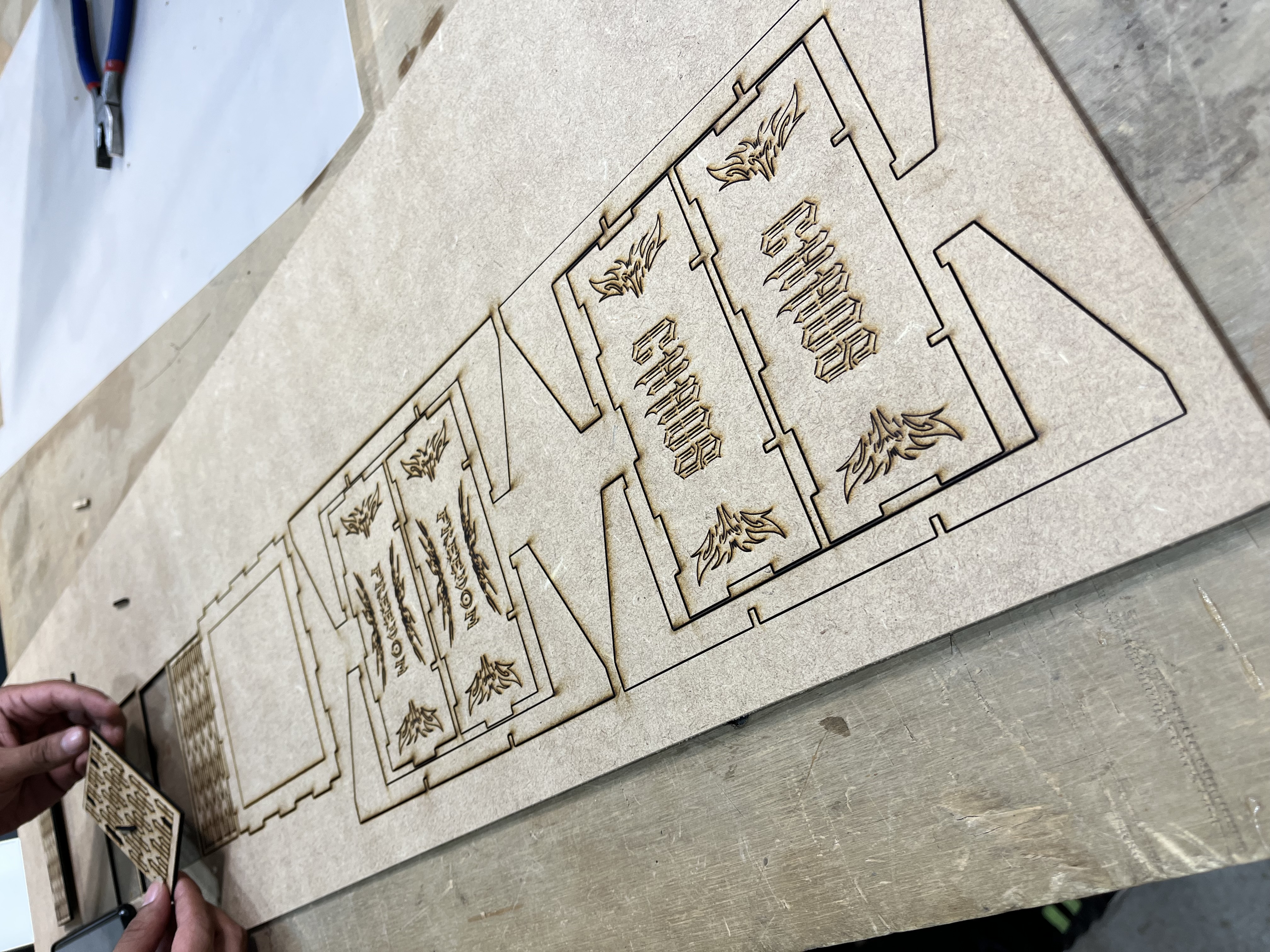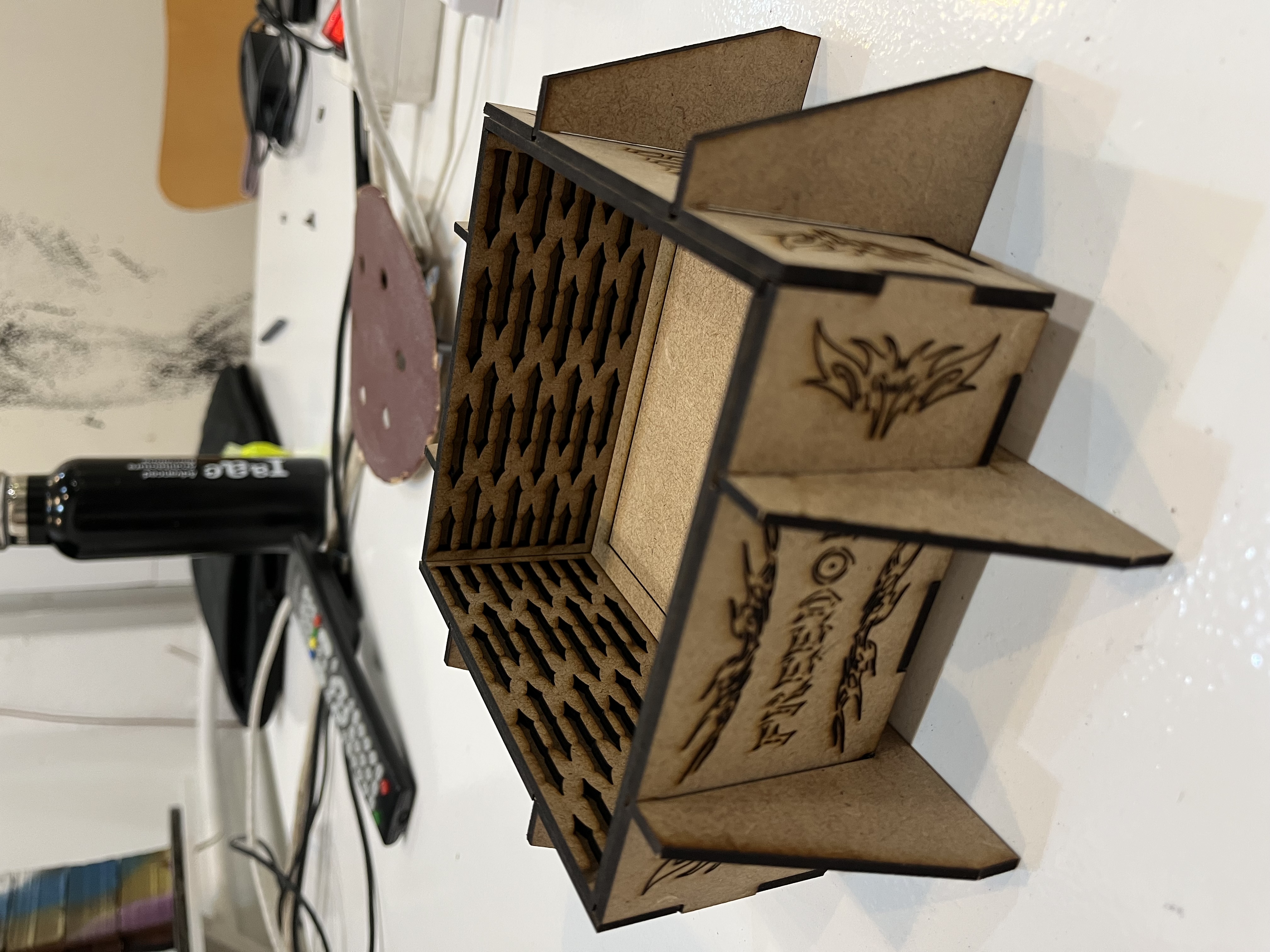 Drawing from references such as tattoo art, graffiti, and vinyl sticker aesthetics, we developed a strong visual language for the project. These influences shaped the graphic treatment of the box’s exterior, while the interior was conceived as a textured surface to introduce relief into the silicone mold. Using Rhinoceros 7, we designed the full pattern and construction layout digitally before fabrication, ensuring precision and consistency. The base includes a simple square indicator that defines the exact position for placing the 3D-printed object during the mold-making process.