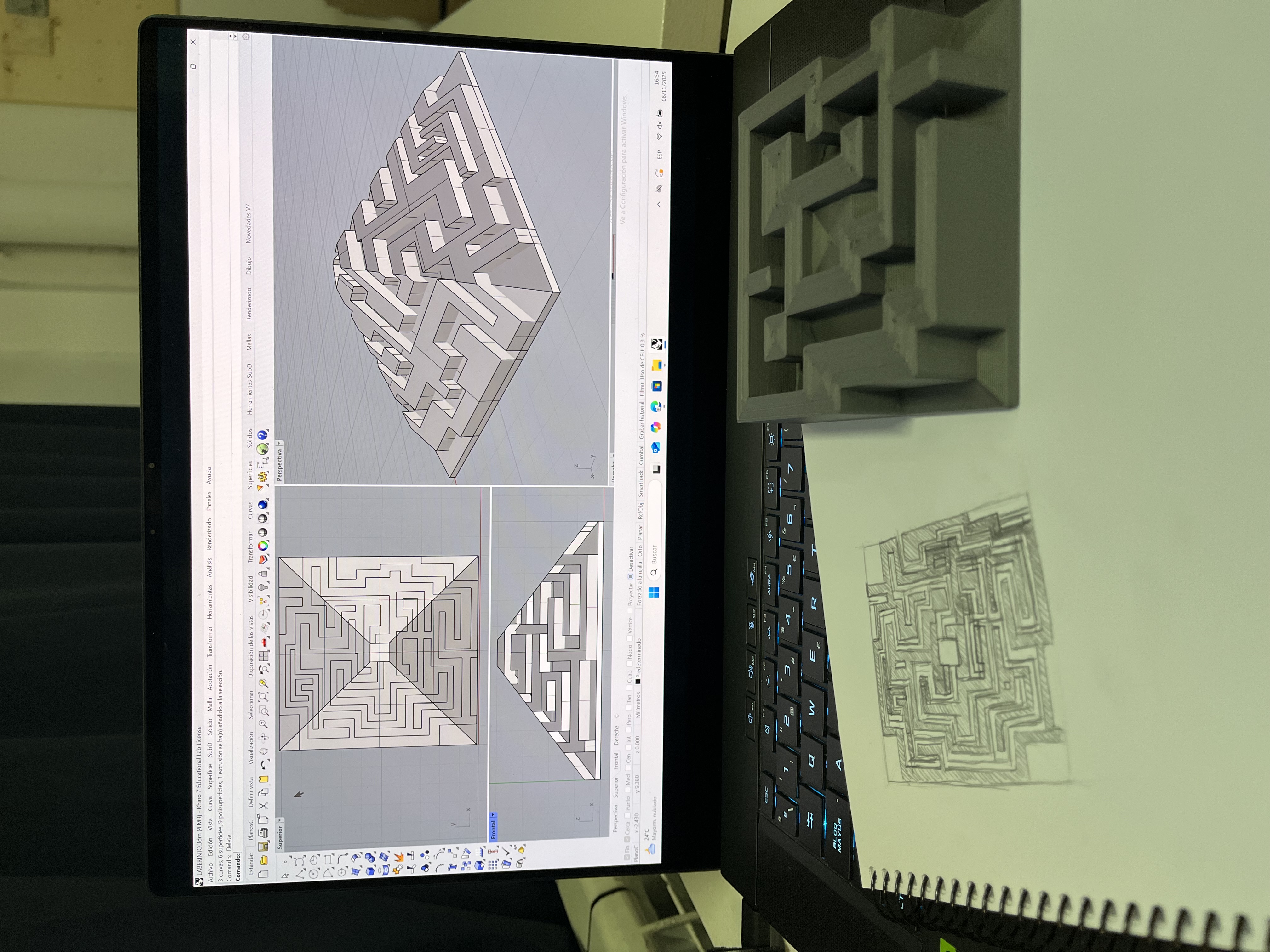 For the 3D printing module, we designed a maze as an interactive object, conceived as a piece that could later be used with a marble to create a playful, hands-on experience. The first prototype was intentionally simple, but when we instructed the 3D printer to generate a concentric pattern, the resulting wall surfaces became irregular and inconsistent. After identifying these issues, we refined the geometry and improved the overall design. However, the mold prepared for the following class had already been produced using the initial version of the maze. The printing process was programmed and managed using Bambu Lab, allowing us to control parameters and iterate on the design efficiently.