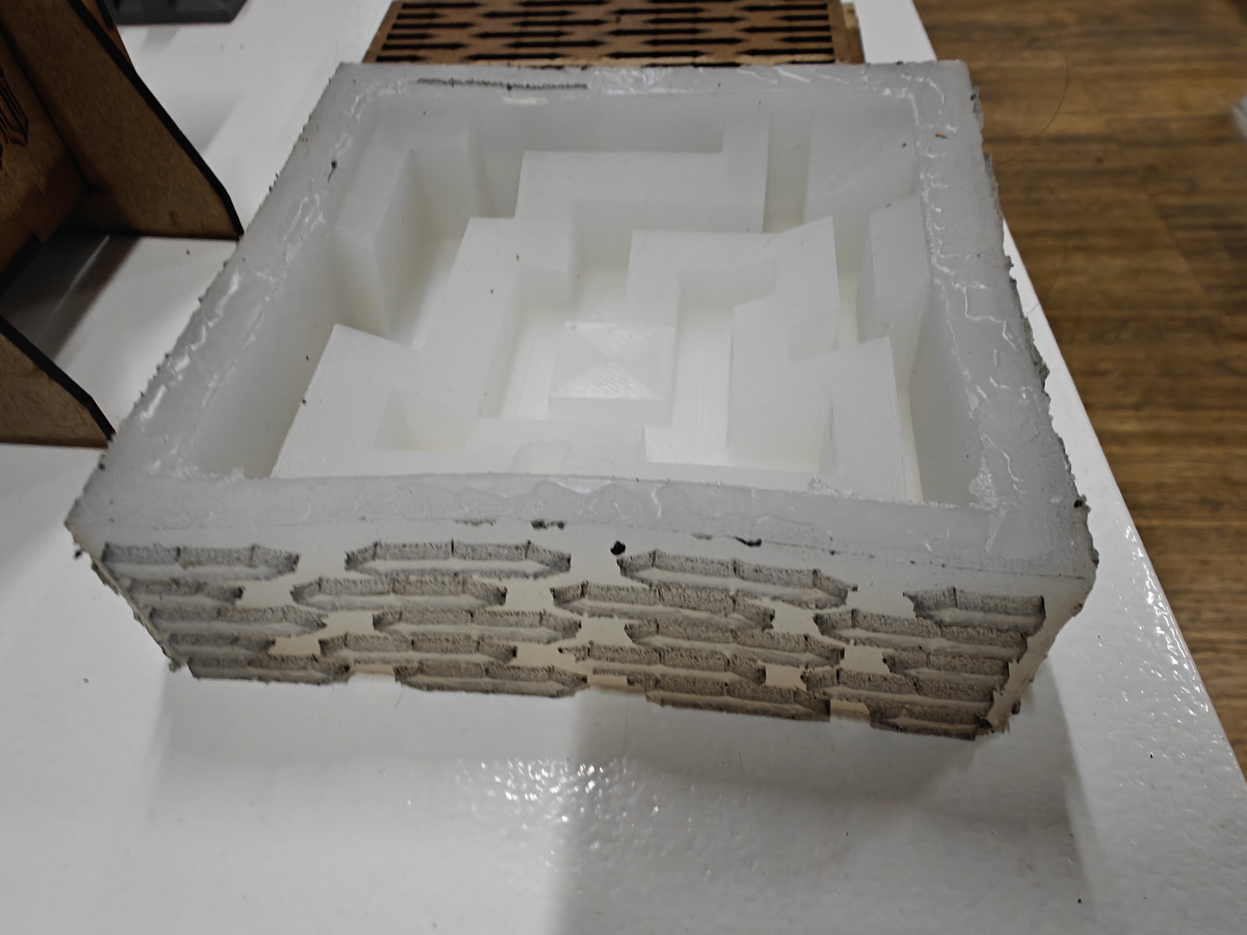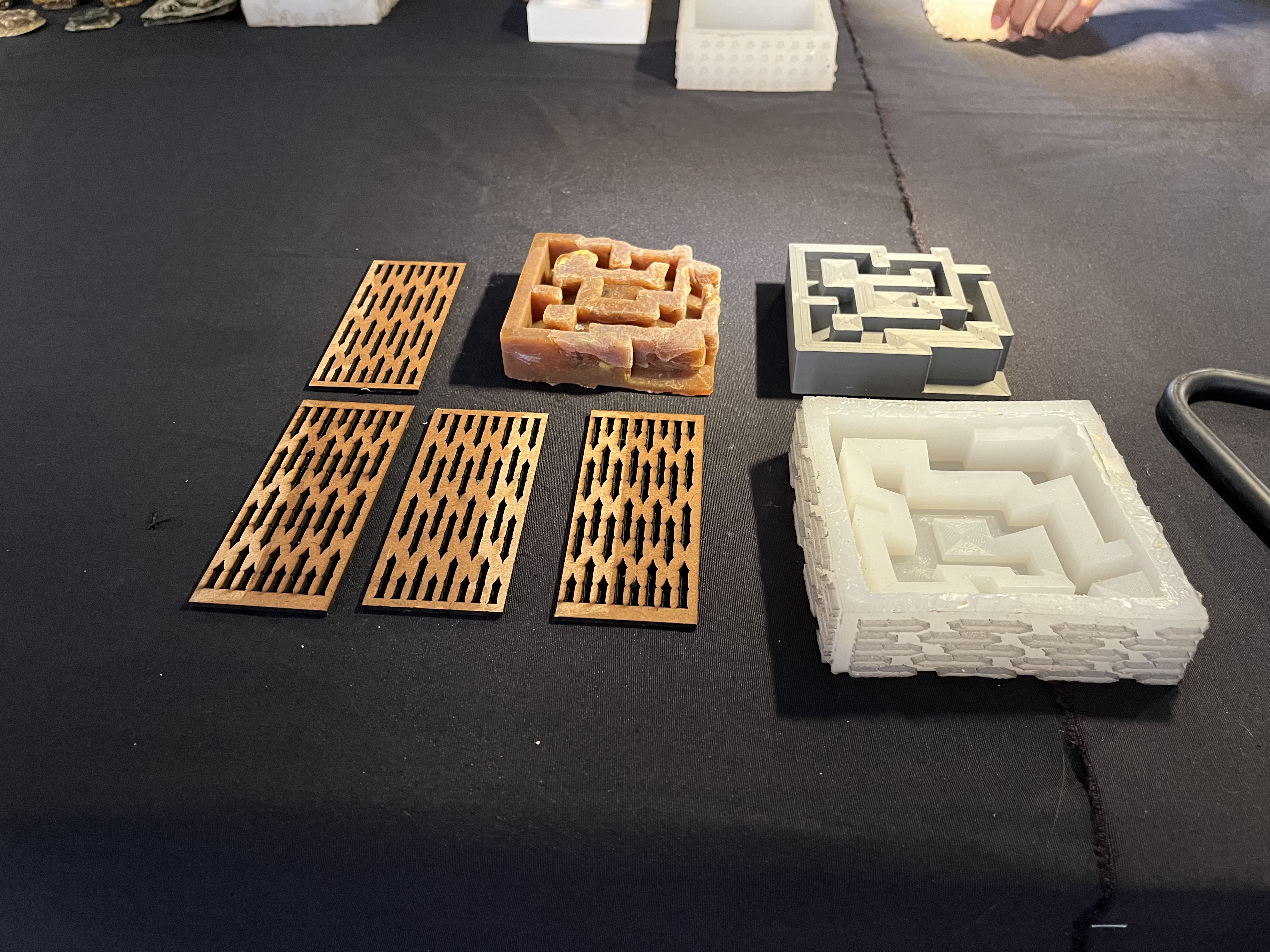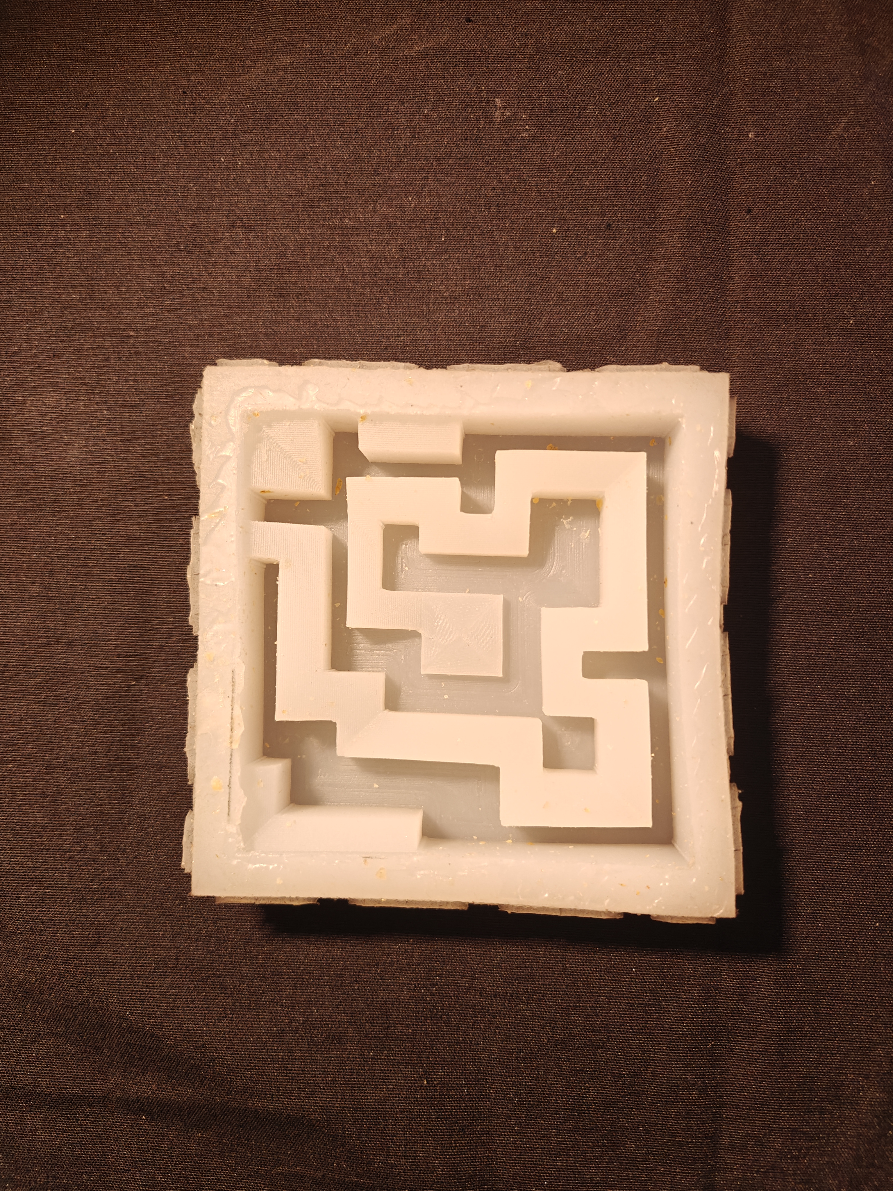 The mold was produced by combining the laser-cut box with the 3D-printed maze, filling the cavity between them with silicone. This stage required careful preparation, as the silicone demanded extensive mixing and precise handling, making the process both time-consuming and delicate. An additional difficulty emerged from minor gaps between the assembled box components, which caused small leaks during the pour and required constant attention throughout the curing process.